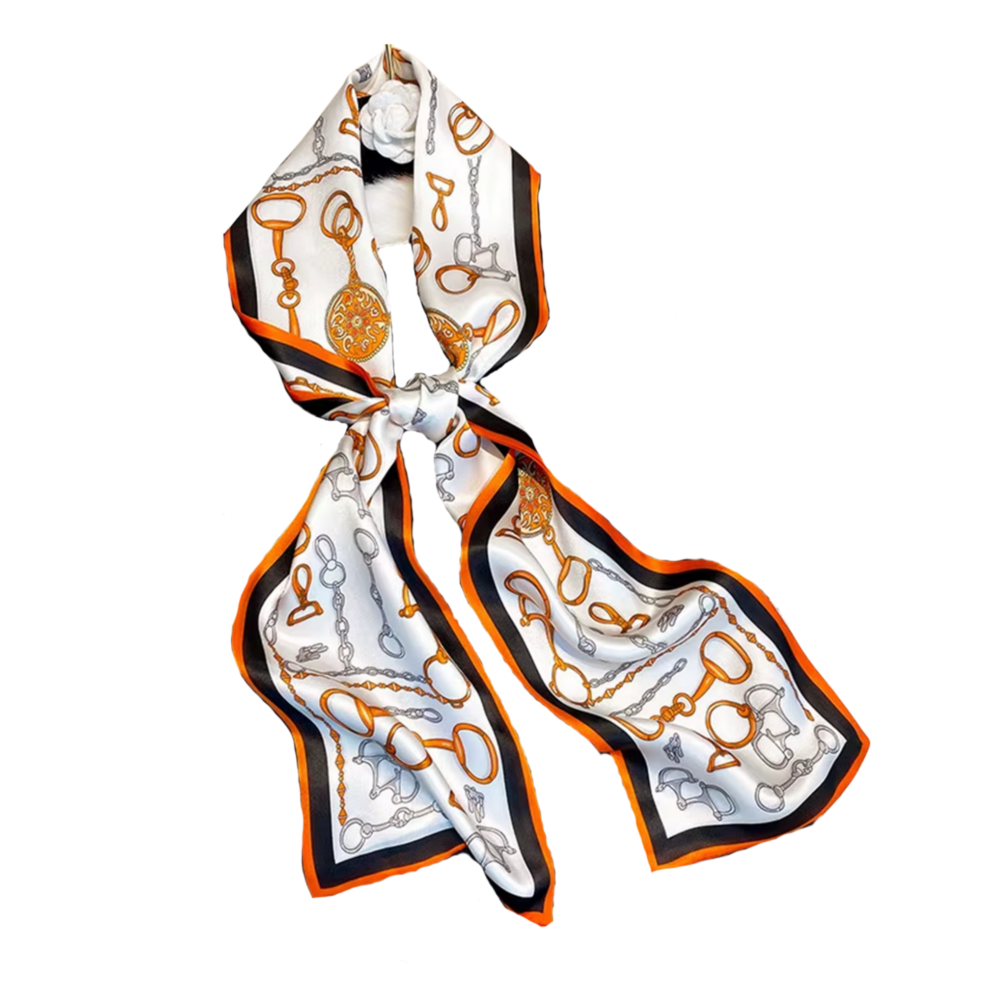 A skinny scarf can be tied around the neck for a  for a chic look, used as a stunning hair tie on a pony tail, or tied around the crown of a hat.