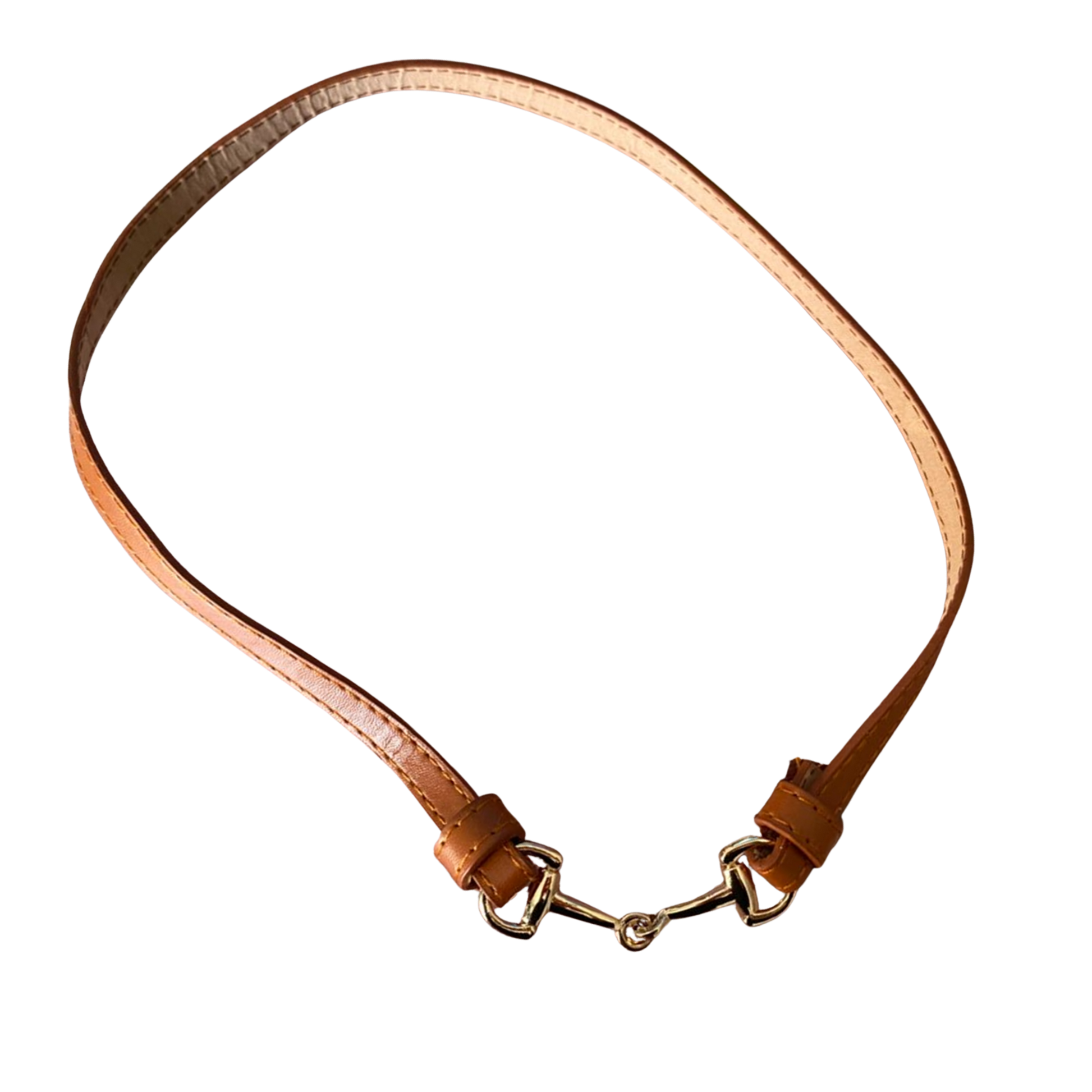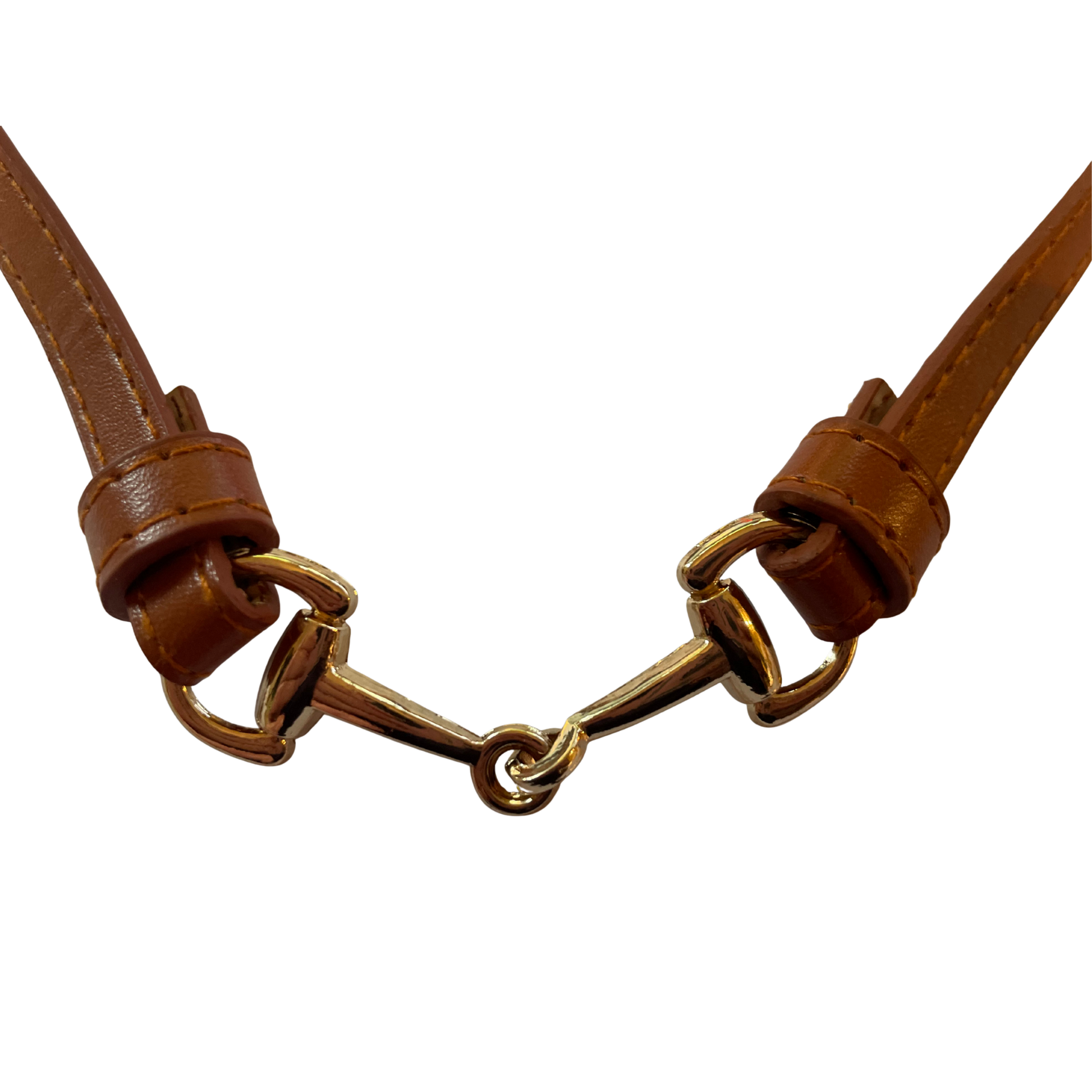 This refined hat band features a stitched, narrow mid-brown vegan leather with an equestrian-inspired snaffle bit accent. The supple vegan leather offers a classic look, while the polished snaffle bit adds authentic country charm.