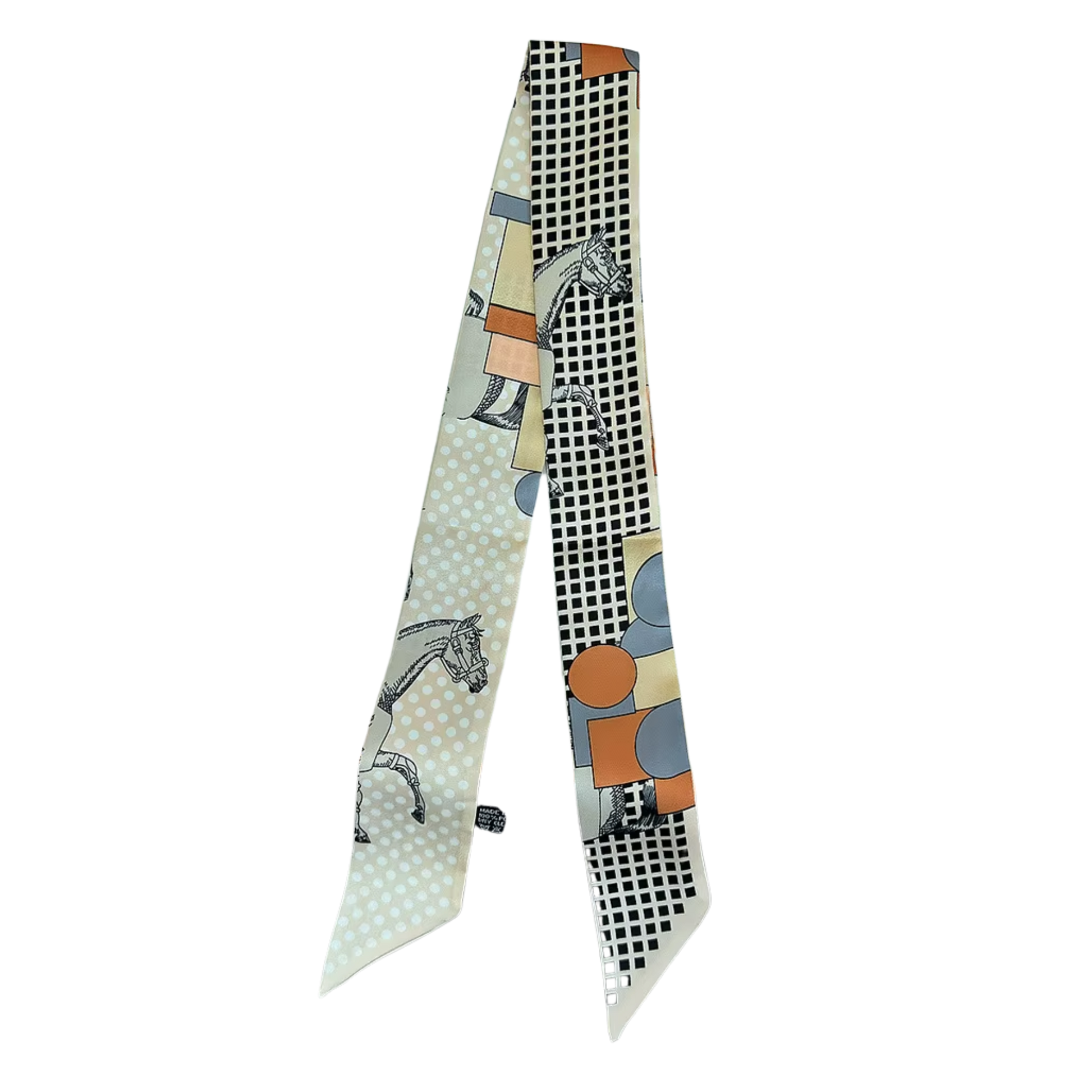 A twilly scarf, a long and narrow piece of fabric, that has a robust "twill" weave, and offers a versatile array of uses that extend beyond traditional neckwear.