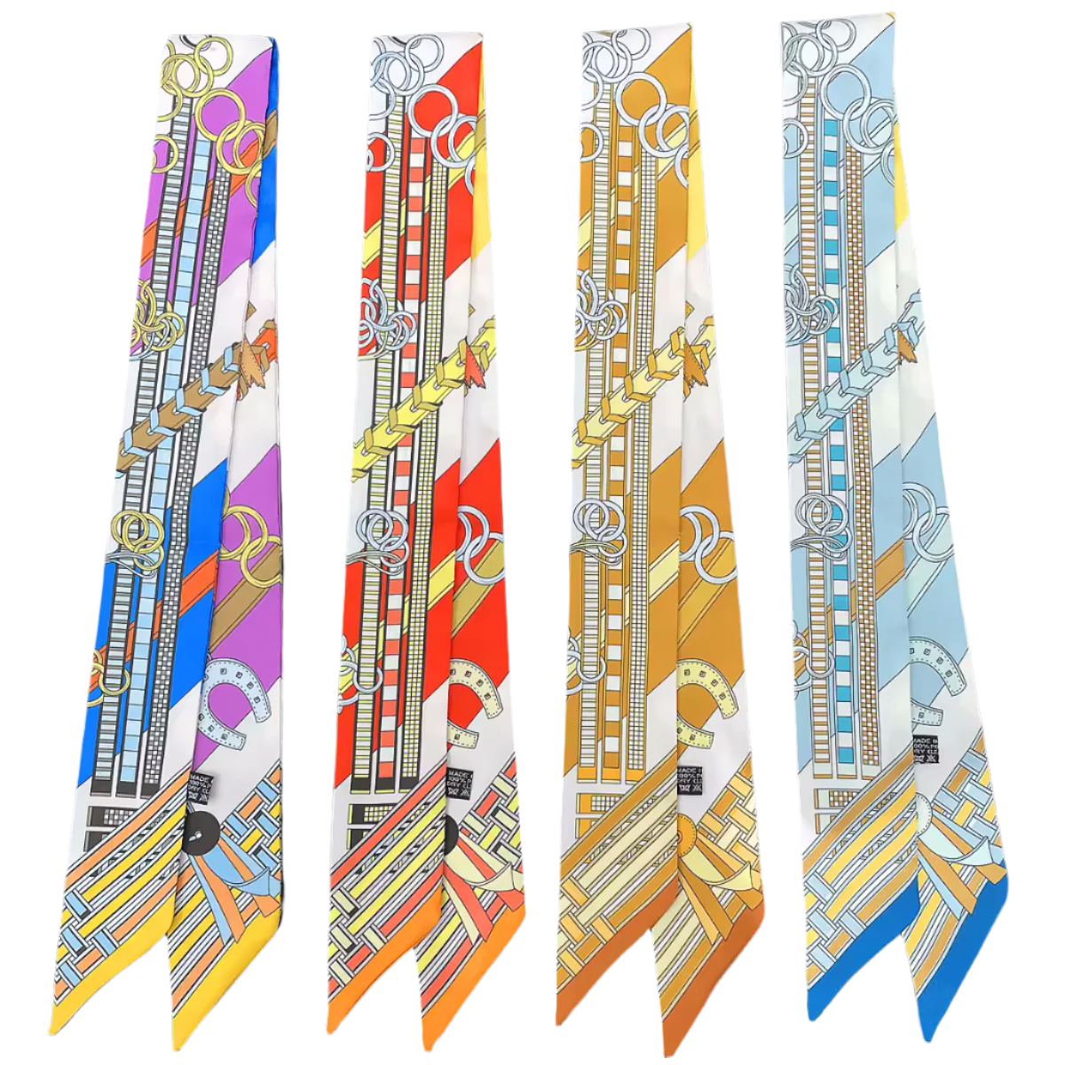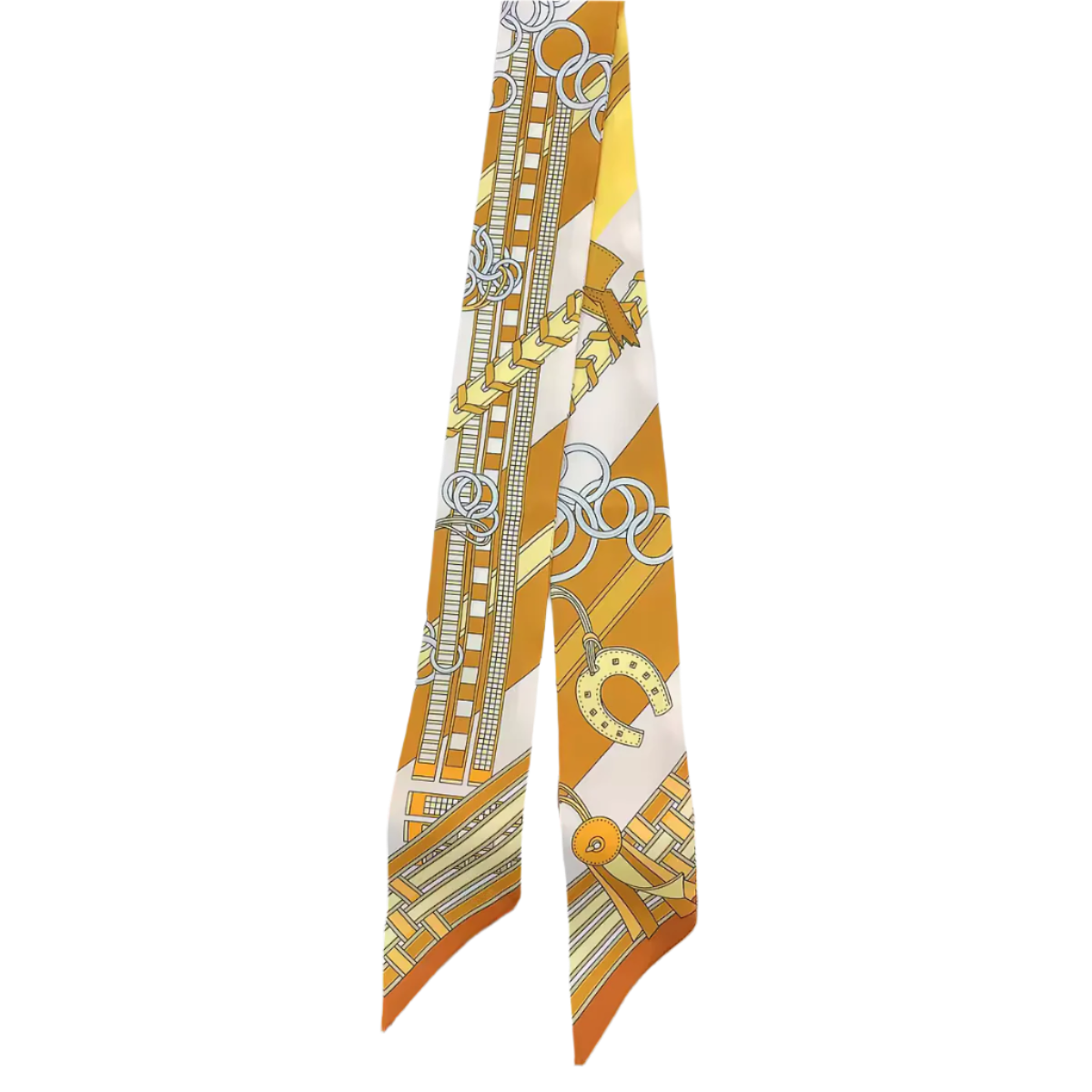 A twilly scarf, a long and narrow piece of fabric, that has a robust "twill" weave, and offers a versatile array of uses that extend beyond traditional neckwear.