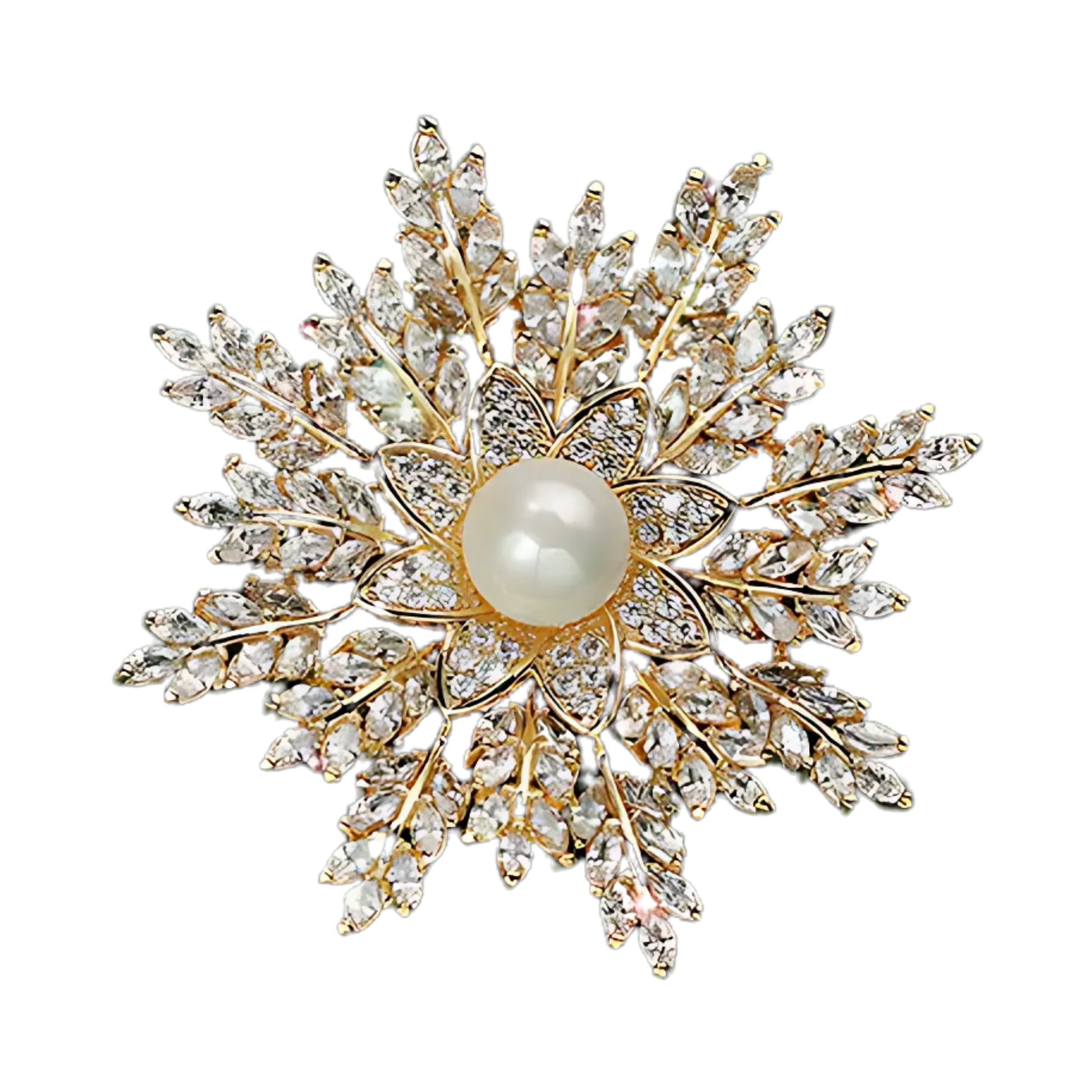 This brooch is a gorgeous piece of jewelry, featuring a dazzling array of Austrian crystals that catch the light with every movement. Its intricate design is complemented by a man-made pearl, which add a touch of elegance and sophistication.