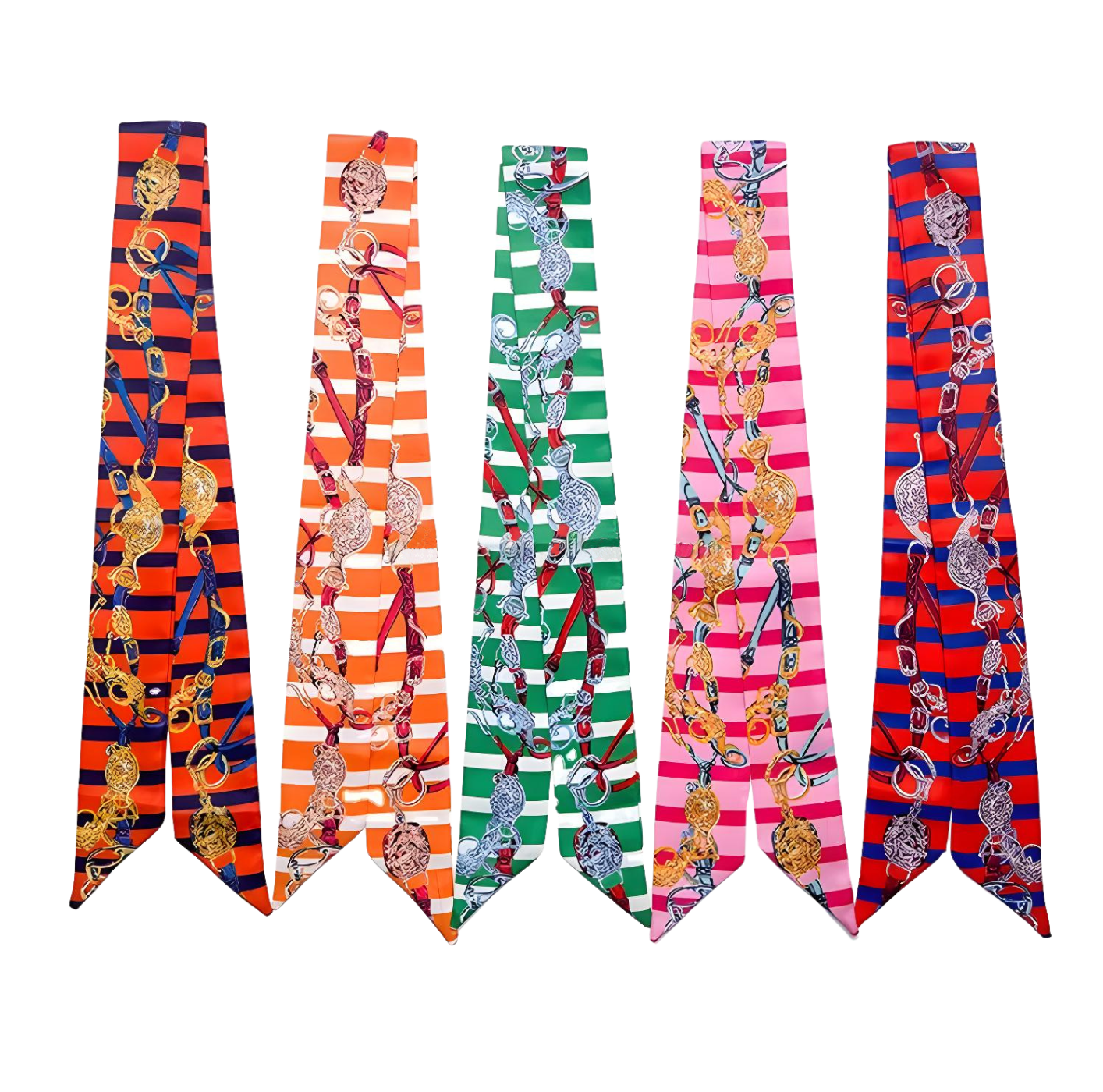 A twilly scarf, a long and narrow piece of fabric, that has a robust "twill" weave, and offers a versatile array of uses that extend beyond traditional neckwear.